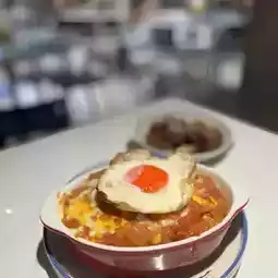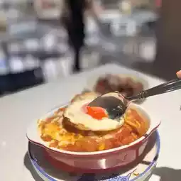 Full of meat sauce covered with egg fried rice, then spread with threaded cheese on top to bake. The fried rice was rather dry and served with a soggy meat sauce to make it just right moist. The meat sauce is sweet and sour, and the orange-yellow half-cooked orchid egg makes the baked rice more attractive. Mix the egg and cheese slightly before eating, and the evil will be doubled!