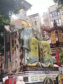 The temple area has a large statue of Kwun Yam on the left side of the temple.