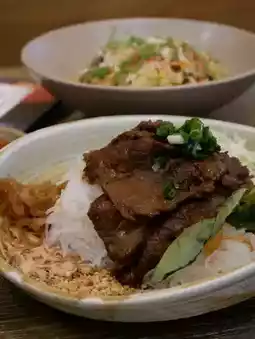 This portion is larger. In addition to the main course of lemon vermicelli and large slices of roast beef🥩, there are also shredded radish🥕, shredded cucumber🥒, coriander, pickled cabbage, crushed peanuts🥜 and fried🧄 onions. First sprinkle the sauce on the lemon vermicelli, then mix all the ingredients. The beef🥩 has a soft and chewy texture, and paired with the slippery lemon vermicelli, it has a rich and flavorful taste😋.