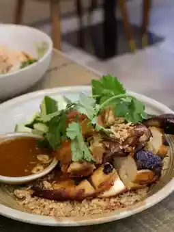Marinated with lemongrass, coconut sugar and lime, the chicken skin is baked until crispy with a hint of burnt aroma🤤, the meat is tender and tasty, and served with a sauce made of tamarind juice and lime, it makes people want to eat it non-stop😋.