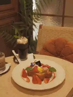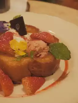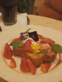 I also like its toast because it looks great. The toast is crispy on the outside and soft on the inside. It is paired with slightly sour strawberries to balance out the sweetness of the toast. There is also a scoop of wine-flavored strawberries and vanilla ice cream for a richer taste.
