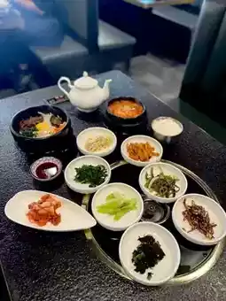 After sitting down, the waiter served a variety of Korean appetizers and hot tea.