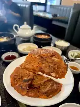 Finally, I tried the kimchi pancakes. This pancake is big and thick, crispy on the outside and soft on the inside. It tastes good.