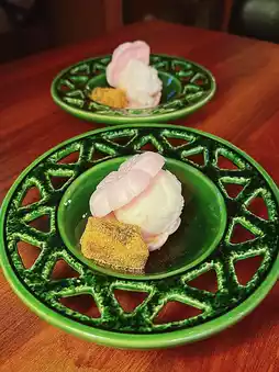 Dessert cherry blossom 🌸 crispy biscuits sandwiched with wine sorbet and black sugar biscuits are not too sweet 🤩 looks very beautiful 😍