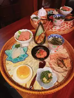 Crab meat ice 🦀 geobuck sashimi, beef salad 🥗 mooncake chicken skewers 🐣 tea-soaked rice, grilled white eel, cold okra and toasted salmon caviar 🤩