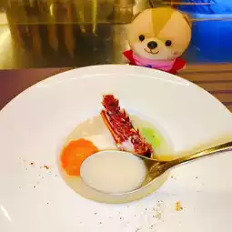 The burning of the sail stand was performed in front of the table, which was a visual and olfactory enjoyment 😆, and the smell was very fragrant. The scallop has thick meat and is even more delicious when paired with salmon roe and basil flowers. The soup is rich and has a wine aroma. It turns out to be Erguotou🤭.
