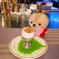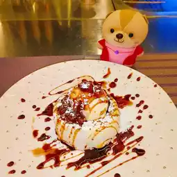 An attractive dessert with a slightly crispy outer layer made of iron plate, covered with black sugar syrup and red beans🤤. The souffle has a rich egg flavor, and the texture is soft and airy 😝. There are two flavors of ice cream. I chose the tofu flavor, which is sweet and soft.