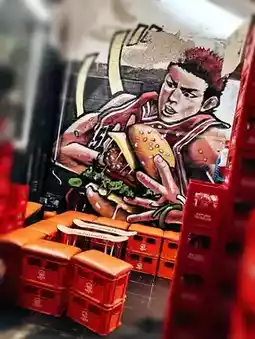 Even next to the restroom there is a classic boy-in-bottle graffiti wall🏀