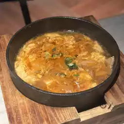 The tofu is smooth and served with pork, kimchi and egg flakes. The overall taste is rich and quite tasty