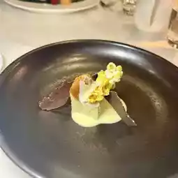 Another favorite of mine🤤 Black truffle cheesecake, with popcorn, vanilla sauce and chocolate, multiple flavors, for the perfect ending to this meal.