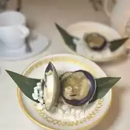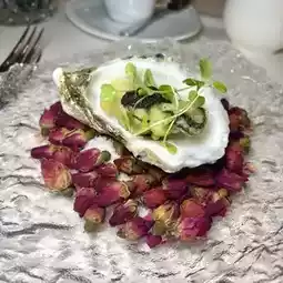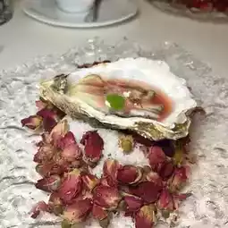 The bottom of the oysters is covered with lots of dried roses 😍 The oysters are rich in seawater freshness 🤤 Super fatty and sweet, and paired with Homemade Watermelon Sorbet, Feta Cheese, Arima Sansho as a sauce, sweet and sour and more refreshing 👍🏻
