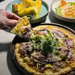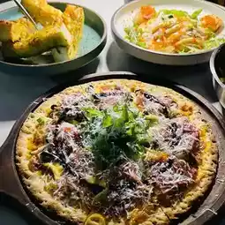 Spanish air-dried ham pizza, Pizza The crust is thin and crispy with a wheat flavor, full of fillings, mushrooms, air-dried ham, and shredded cheese, served with pizza traditional tomato sauce and cheese