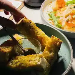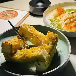 Cheese strips garlic bread with lobster sauce, the most surprising of the night, garlic bread long strips, crispy outside and soft inside, full of garlic butter fragrance, cheese baked smoky, has been super tasty, surprise is even club lobster sauce, taste more rich