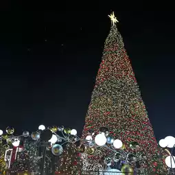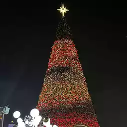 A giant Christmas tree over 20 meters high stands, hung with colorful lights and decorated with a giant shining five-pointed star on the top of the tree.