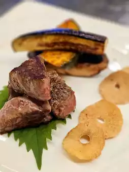 🥩 Kumamoto Prefecture A5 thick-cut grilled with fragrant pan-fried wild vegetables: A5 thick-cut grilled I chose five percent cooked, Wagyu beef is bright in color, rich in meat, and overflowing with fat! Put a slice of crispy garlic together and eat together, the aroma is overwhelming! Served with pan-fried wild vegetables, refreshing and refreshing!