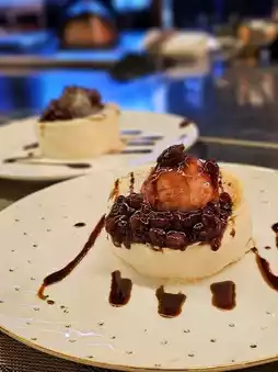 🍨🍫Iron Plate Soufflé Ice Cream: Hot soufflé ice cream on an iron plate, crispy on the outside and soft on the inside, plus sweet red beans and ice cream ~ perfect ending!