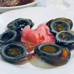 The taste of sweet and sour with ginger is fresh and fresh, as an appetizer before a big meal. The sourness of ginger is sweet and spicy, with a smooth texture of preserved egg, one acid and one alkaline, the protein is crystal clear, full of taste and middle The melted part is smooth and glutinous with egg flavour