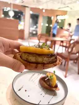 The goose liver is served with peach and garlic bun.