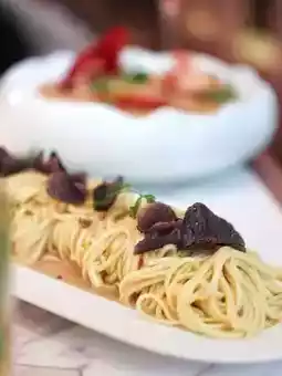 The handmade spaghetti is bouncy and rich in egg flavour, with Parmesan cheese and truffle slices to make the flavor more intense and emit a truffle aroma😊