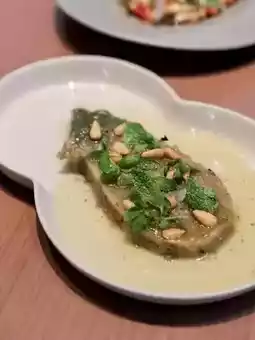 Mini eggplant is made from charcoal grilled eggplant puree, cute shape😍 Sweet and smooth, seasoned with mint and basil and other spices, then added pine nuts to increase the taste✨