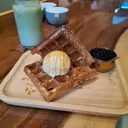 The waffle is crispy on the outside, soft on the inside, the ice cream balls are smooth, and add some caramel pearls for a richer taste.