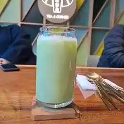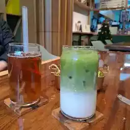 Served with a meal of iced mint milk greens, white peach oolong tea and Uji matcha latte.
