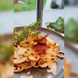 For the main course, I tried the crispy pork cheek carbonara handmade pasta and Japanese mint cream sauce with pan-fried shrimp flower ring handmade pasta. Both were delicious. The crispy pork cheek was a little like parma ham, salty and crispy
