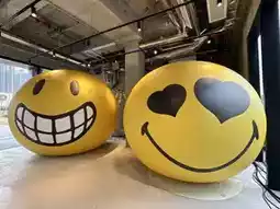 Next to the outdoor Christmas tree is a Smiley World-themed check-in space.