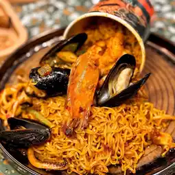 I have to say, this Chaos Cup Noodles is super delicious ๐คฃ!! There are chewy tiger prawns and big mussels. The noodles are chewy, with a seafood flavor and a bit of spiciness.