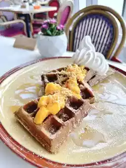 Honey black tea waffles with mango, shredded coconut, and Hokkaido milk ice cream. The waffles🧇 are served warm, crispy on the outside and soft on the inside. Served with very sweet mango, the sweetness is further enhanced. The ice cream has a very rich milk flavour. It's delicious when eaten with waffles, alternating hot and cold🤤