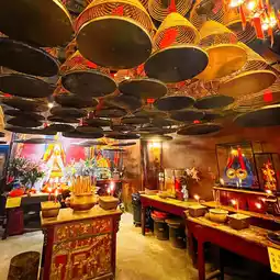 Inside the temple, red incense circles are lit all over the ceiling. This type of incense circle takes about 3 weeks to burn out, unlike regular incense sticks. There is a bell on the side for making wishes.