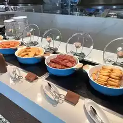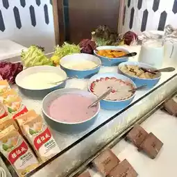 🥯 There are many choices of buffet breakfast styles, with yogurt fruit, a variety of dim sum bread, French fries, bacon, chicken sausage, fried mushrooms and burger steak.
