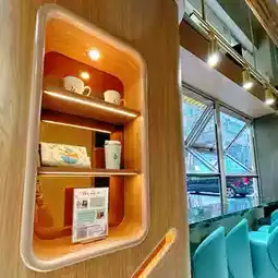 The restaurant is designed with the theme of Harbour, its interior is designed with reference to the characteristic decoration of a ship cabin, using lake blue as the main color, matched with wooden walls and window frames, and soft and comfortable lighting, making people feel leisurely and relaxed.