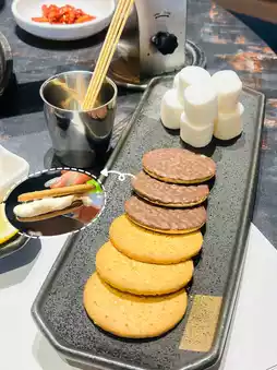 Don’t miss the delicious desserts. Skewer marshmallows with bamboo sticks and roast them on the stove until golden brown. Then sandwich the melted marshmallows between original or chocolate digestive biscuits. The soft and crispy textures complement each other with distinct layers.