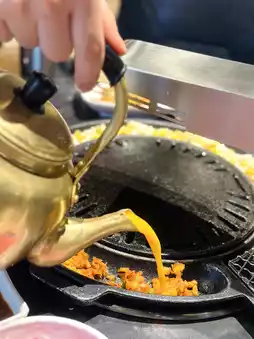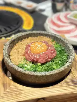 The tender raw beef rice is served with a hot spring egg, garlic, chives and sesame seeds. It is not only a visual enjoyment, but also contains healthy elements. The waiter will help you mix the ingredients in the stone pot rice. The fragrant stone pot rice is full of crispy aroma, and every bite is warm and delicious.