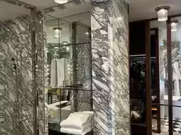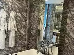 In addition to the magnificent view of the Victoria Harbor outside the window, the hotel room also has an all-marble bathroom, with a large and wide shower with 2 shower heads for two people to share
