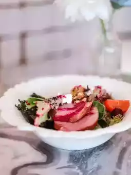 The salad is seasoned with beetroot dressing and served with smoked duck breast, cheese and quinoa. It is savory and refreshing☺️