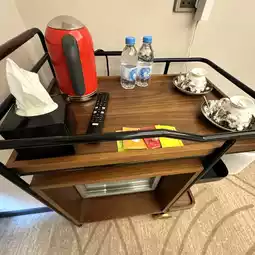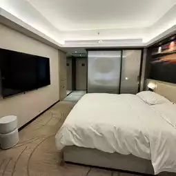 The room is spacious, with a coffee table and a writing desk. There is a refrigerator under the coffee table, a kettle and tea sets on top, and a huge, brand new TV.