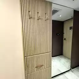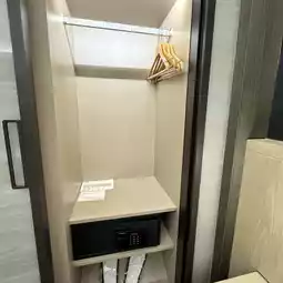 There is a wardrobe next to the bathroom, which contains a safe and slippers.