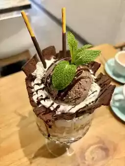 This is a dessert for adults because there is espresso at the bottom and the coffee cake in the middle is slightly bitter, but tastes great with ice cream. The top layer is ice cream and chocolate chips, the middle layer has corn flakes, fine marshmallows and black sugar crystals. Black sugar crystals are refreshing and bouncy, with a rich overall layer. However I think it would be better without the marshmallows.