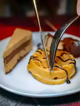 Desserts include chocolate fountain, a variety of cakes🍰, assorted fruit jelly, fresh fruit🍉, my favorite and 3 pieces of crispy waffles🧇, and two brands: Häagen-Dazs and Cocoberry ice cream, each with several flavors🍨; with a cup of coffee machine brewed Cappuccino or drink a glass of juice is simply satisfying🍹