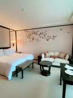 In addition to the touch panel on the wall, there is also an interactive control panel next to the bed, which can control the brightness of the room lights, the temperature of the air conditioner, the curtains and other room equipment. It is very advanced. There is also a wireless charging station for mobile phones, which is very up-to-date!