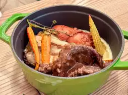 Served with Italian corn cake and dewy barbecue sauce is another Fushion dish, slow-cooked beef cheeks are soft and tender, served with Italian fried corn cake to eat crispy and sweet. The beef cheeks are drizzled with truffle barbecue sauce for added flavour, and there are side dishes on the side.