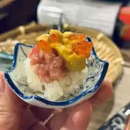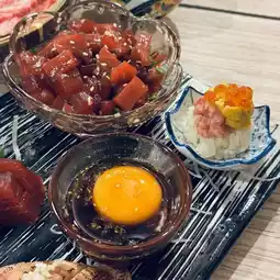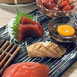 There are six different parts and ways of tuna, two sushi, two sashimi, tuna grains with sesame and raw egg yolk seasoning sauce, tuna puree seaweed salmon seed rice