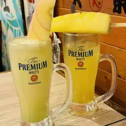 A whole piece of iced big pineapple, very sweet, served with shochu and pineapple juice soda, the taste is full of pineapple fragrance and a little light sake flavor, available to drink and eat, see many customers are drinking this drink