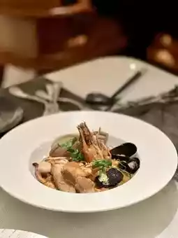 Super rich and filling Risotto, with ingredients including: fresh prawns, squid, mussels, clams, and fish fillet. Each mouthful of rice absorbs the essence of seafood and is very delicious.