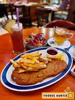 Veal Wiener Schnitzel with Cranberry Sauce French Fries and Salad HKD 250