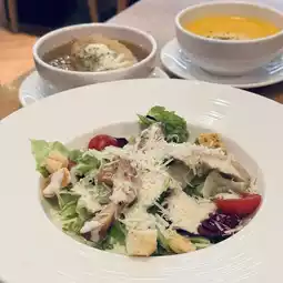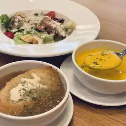 Real onion soup, sweet and clear taste, French bread covered with cheese, very good, pumpkin soup taste rich, creamy taste