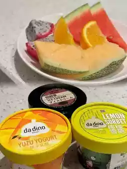 Finally, there are fresh fruits: white flesh dragon fruit, honeydew melon, fresh orange, watermelon pieces, very rich!