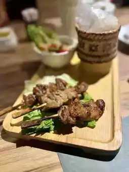 The pork skewers are tender and full of juice, and are grilled with a charred flavour.